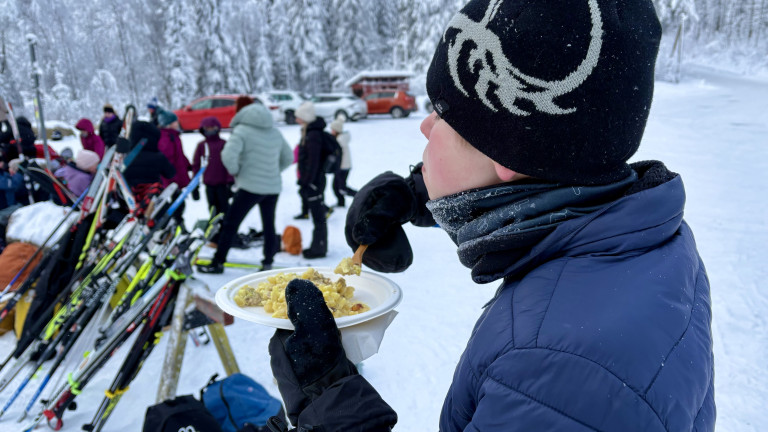 Hiihtelyn jälkeen nautittiin makoisa retkilounas ja jälkiruuaksi oli kaikkien iloksi pullaa. Omille eväillekin saattoi joillakin jäädä vielä tilaa. Sitten olikin aikaa vapaalle leikille, mäenlaskulle ja lähtipä osa lapsista vielä uusille hiihtolenkeillekin.